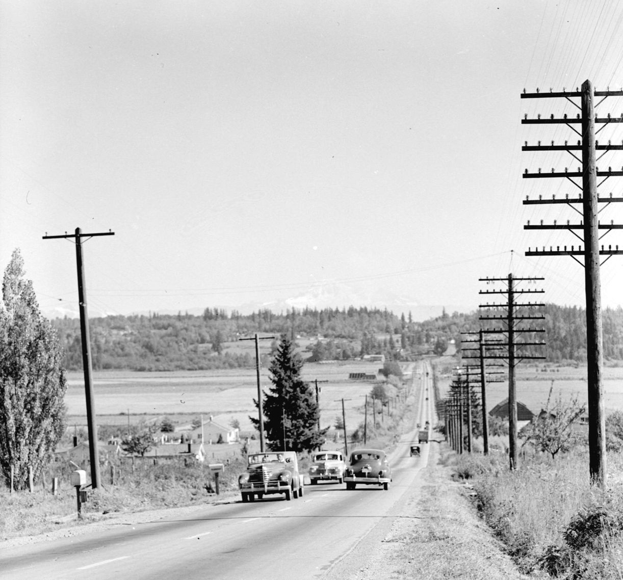 Donn Williams snapped this photograph in 1949. It shows several cars on an unnamed highway near Langley. If you squint at the horizon, you can see Mt. Baker in the distance.