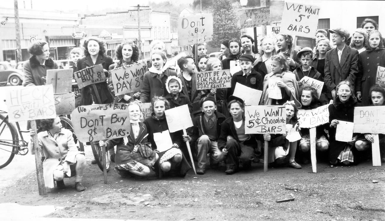 Seventy-five years ago, kids across British Columbia hit the streets to protest price increases to chocolate bars from five cents to eight cents. In Abbotsford, protesters held signs like “HECK with 8¢ BARS.”