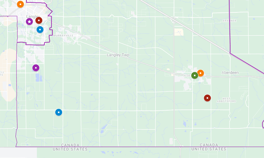 Down by the border, the community of Arnold and surrounding farmland is the most Conservative spot in Abbotsford. But unlike every other party’s top polling station in the riding, the Conservatives actually saw a decrease in their vote share for this area from 2019. The proportion of Conservative votes decreased slightly, while PPC, NDP, and Liberal votes all went up in this polling station.