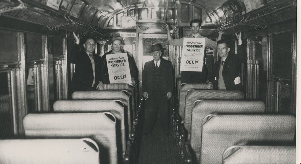 The last run of the interurban to Chilliwack in 1950. Inside Car 1309, four men are posing with signs reading “Interurban Passenger Service Discontinued effective October 1st. ask conductor for a bus schedule.” 📷 Burnaby Village Museum BV985.328.4