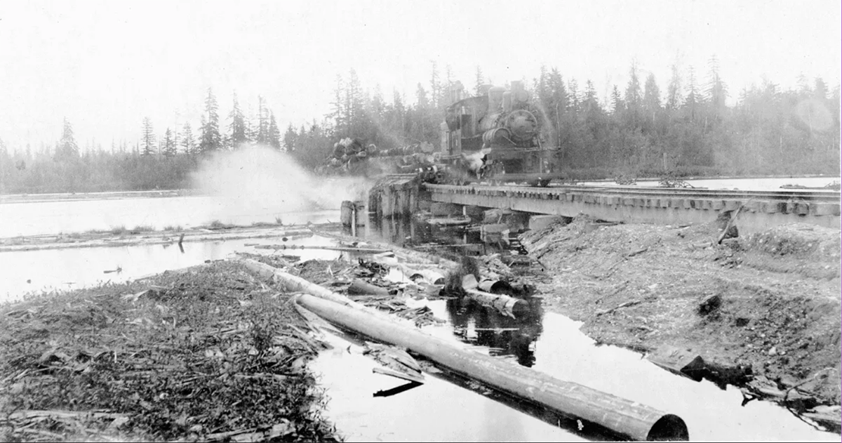 The railway in Abbotsford’s Mill Lake area was, unsurprisingly, a sawmill railway. It was a privately owned rail line used to transport logs from the surrounding area to the mill. Alexander Johnston and James Cook, the owners of the Abbotsford Lumber Company, built the original two-and-a-half miles of line from the mill to the edge of their timber-cutting limit. The mill itself was built in 1907, and the railway was likely built around the same time.