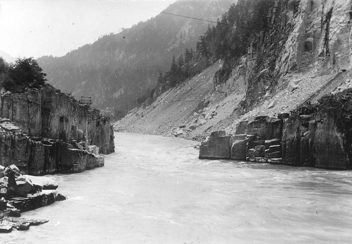 The track was completed through the canyon in 1913, but the following February 100,000 cubic metres of loose granite fell into the river, essentially forming a dam in what was already one of the tightest spots on the Fraser River. The water gushed through a 23-metre channel, forming a nearly impenetrable barrier for the salmon that would be coming later in the year. Although work began in the spring to remove the rock, and Indigenous men were hired to move fish over the slide using nets, it wasn’t enough. That year’s salmon run above the slide was dismal, causing widespread famine upstream. Without their prime source of food, an estimated one-fifth of residents in nearby Indigenous communities starved to death.