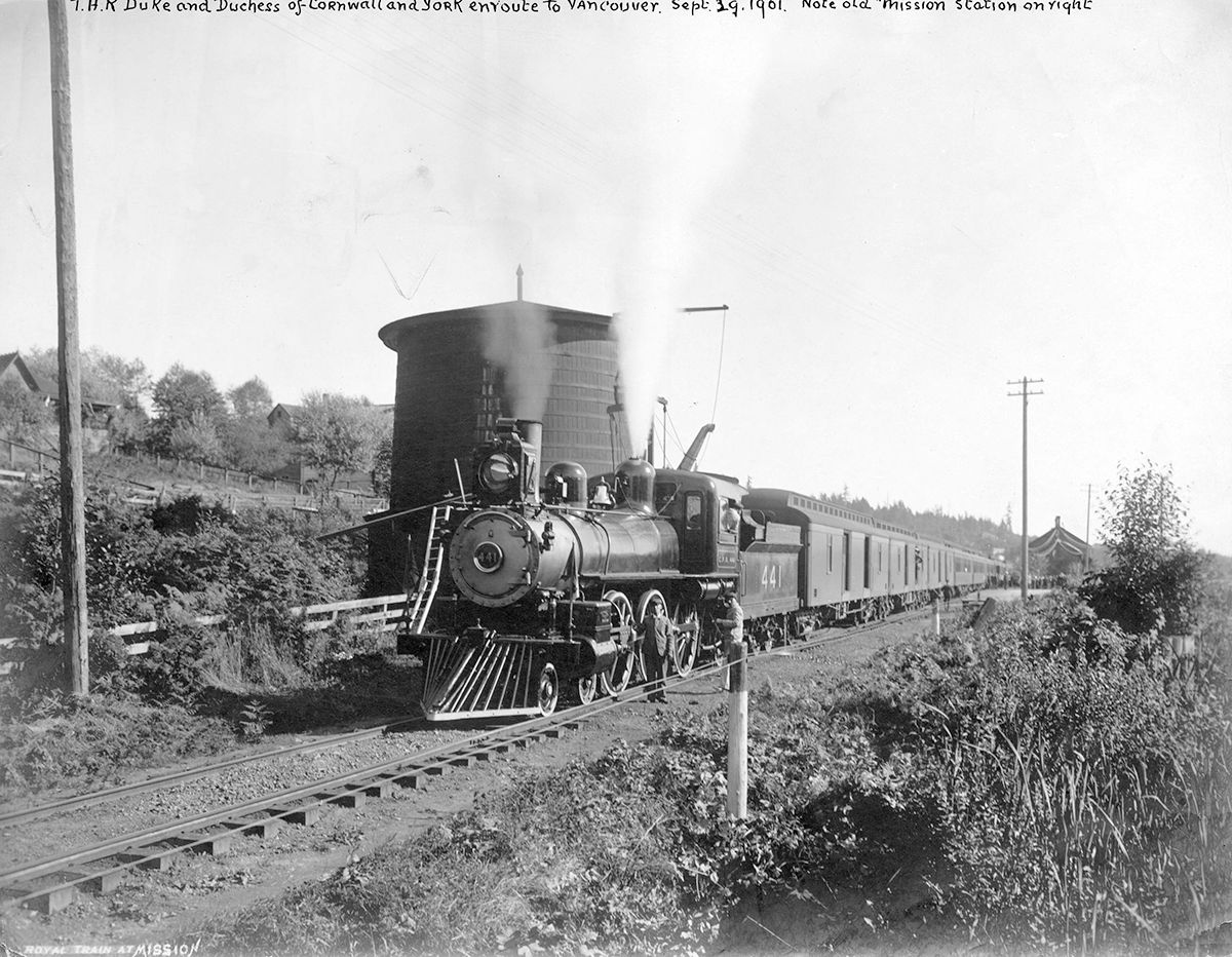 A CPR train carrying the Duke and Duchess of Cornwall and York passes by Mission in September 1901. 📷 Vancouver Archives AM54-S4-: Duke of C and Y P16.4