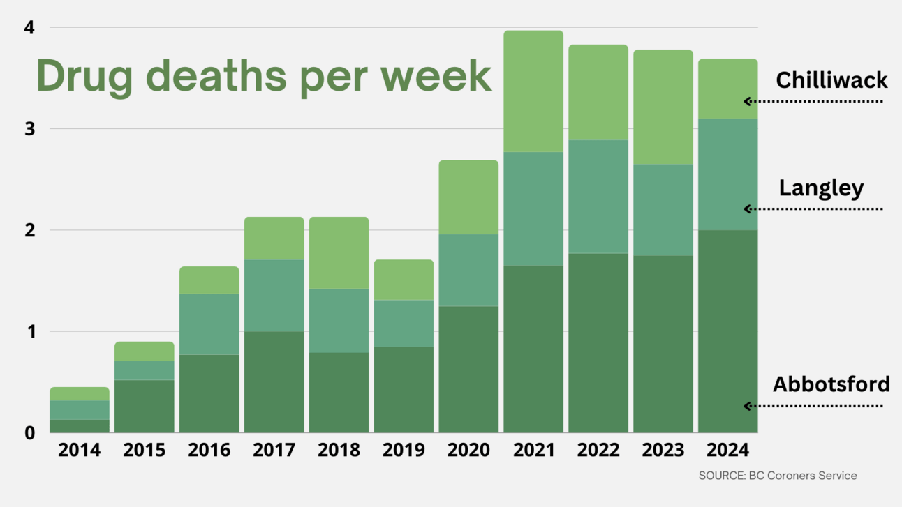 In the first two months of 2024, 37 people have died in the Fraser Valley due to toxic drugs. Most of those deaths were in Abbotsford, where 17 people died. Nine people died in Langley, and five in Chilliwack. The remaining six deaths were in the region’s smaller communities: Mission, Agassiz, Harrison, and Hope.