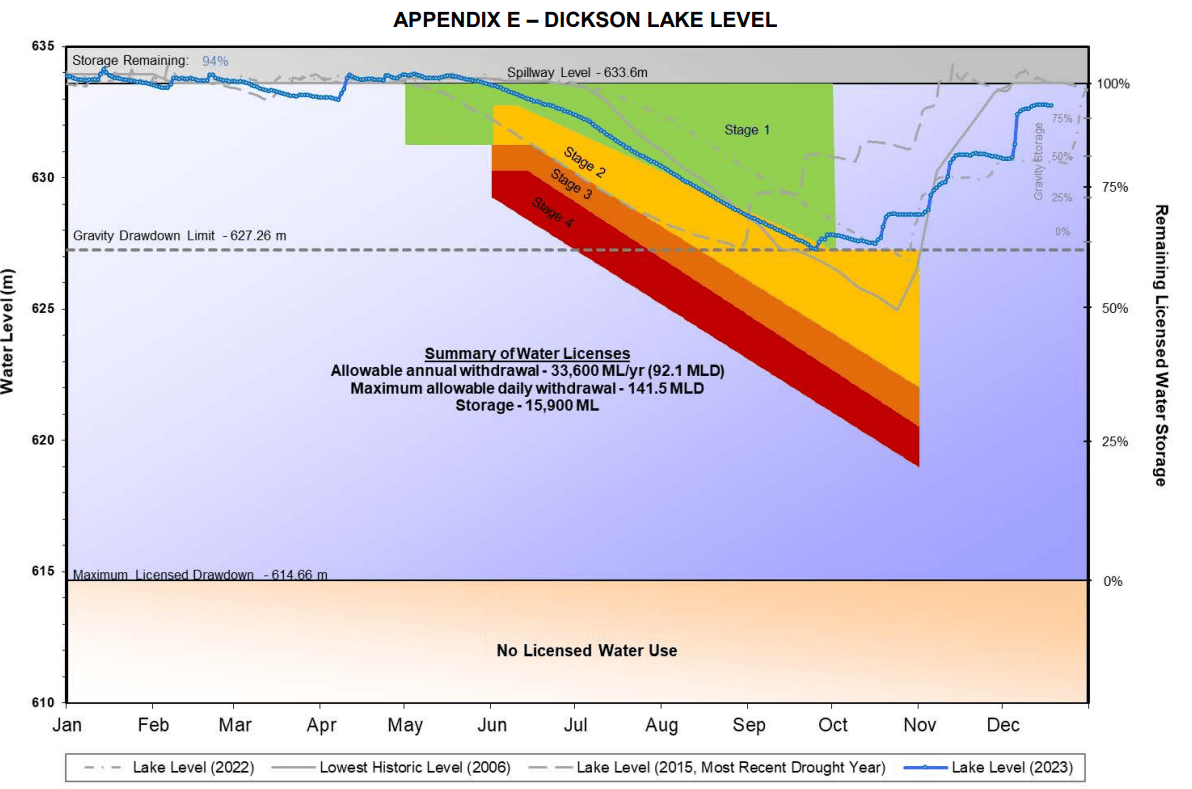 Although last year’s spring began exceptionally early, a burst of precipitation in April allowed Dickson Lake—the key reservoir for the city—to remain mostly full into June. And though little rain fell during the summer, the supply of water was able to keep up with the demand of users until September, when wet weather returned. That’s despite Abbotsford’s highest level of water consumption since at least 2015.
