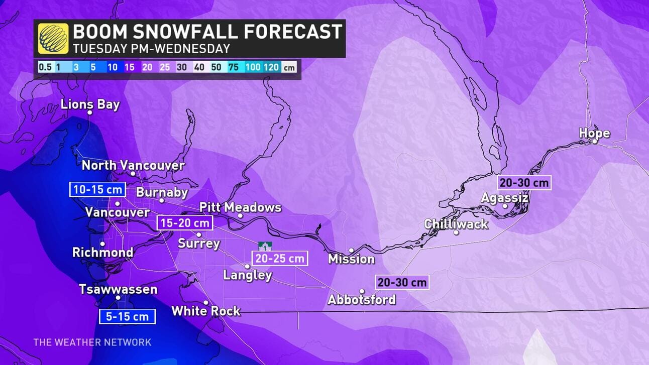 The Fraser Valley could receive up to a foot of snow over the next 48 hours, according to Weather Network forecasters. 🗺 Tyler Hamilton/X/Weather Network