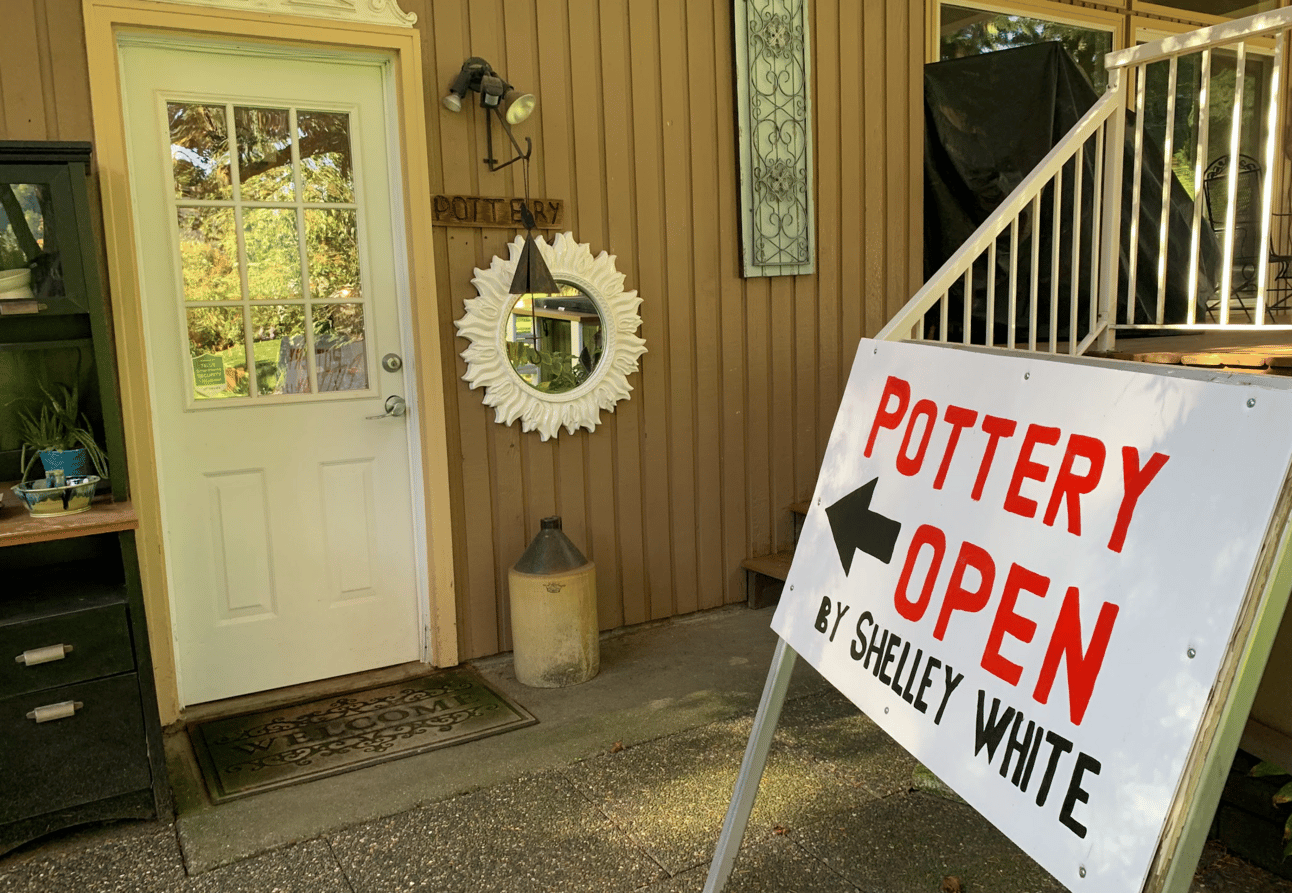 The sign on the road was for pottery by Shelley White. Another sign points me down the artist’s driveway and still another sends me around the garage to the house’s backyard. The quest continues.